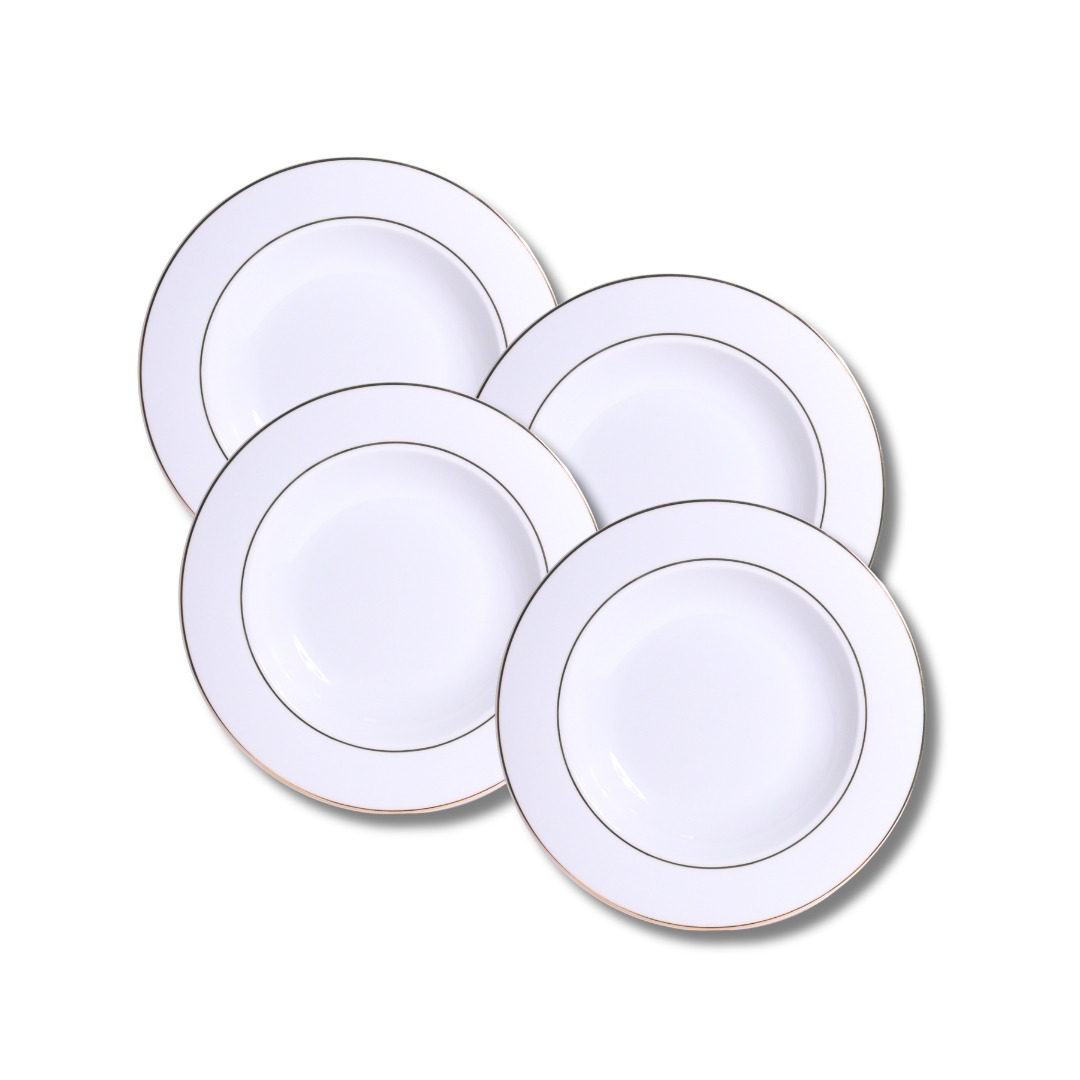 Jogo 4 Pratos Fundos 21,5 cm cor Branco com friso dourado coleção MAJESTY GOLD por L'HERMITAGE. Produtos em porcelana de alta qualidade.
