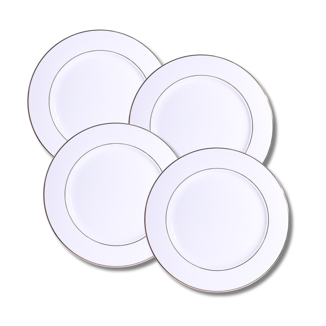 Jogo 4 Pratos Rasos 26,5 cm cor Branco com friso dourado, coleção MAJESTY GOLD, por L'HERMITAGE. Produtos em porcelana de alta qualidade.