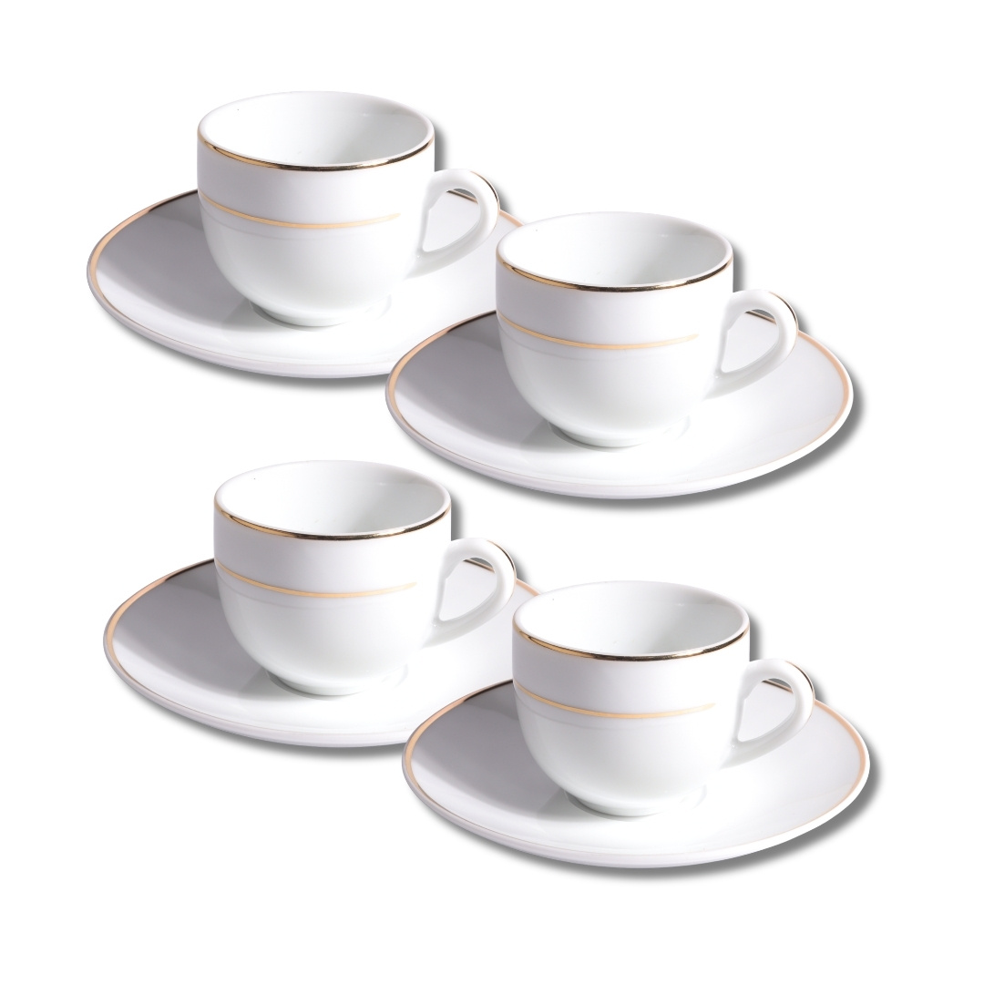 Jogo 4 xícaras de café de 90 ml com pires, na cor branca com friso dourado, coleção MAJESTY, por L'HERMITAGE. Produtos em porcelana de alta qualidade, com delicado acabamento dourado.