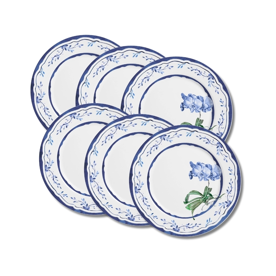 Com fundo branco e decoração floral azul, o design é clássico e atemporal, combinando perfeitamente com mesas elegantes, estilos costeiros ou composições mais contemporâneas. Um conjunto que une charme, leveza e versatilidade.