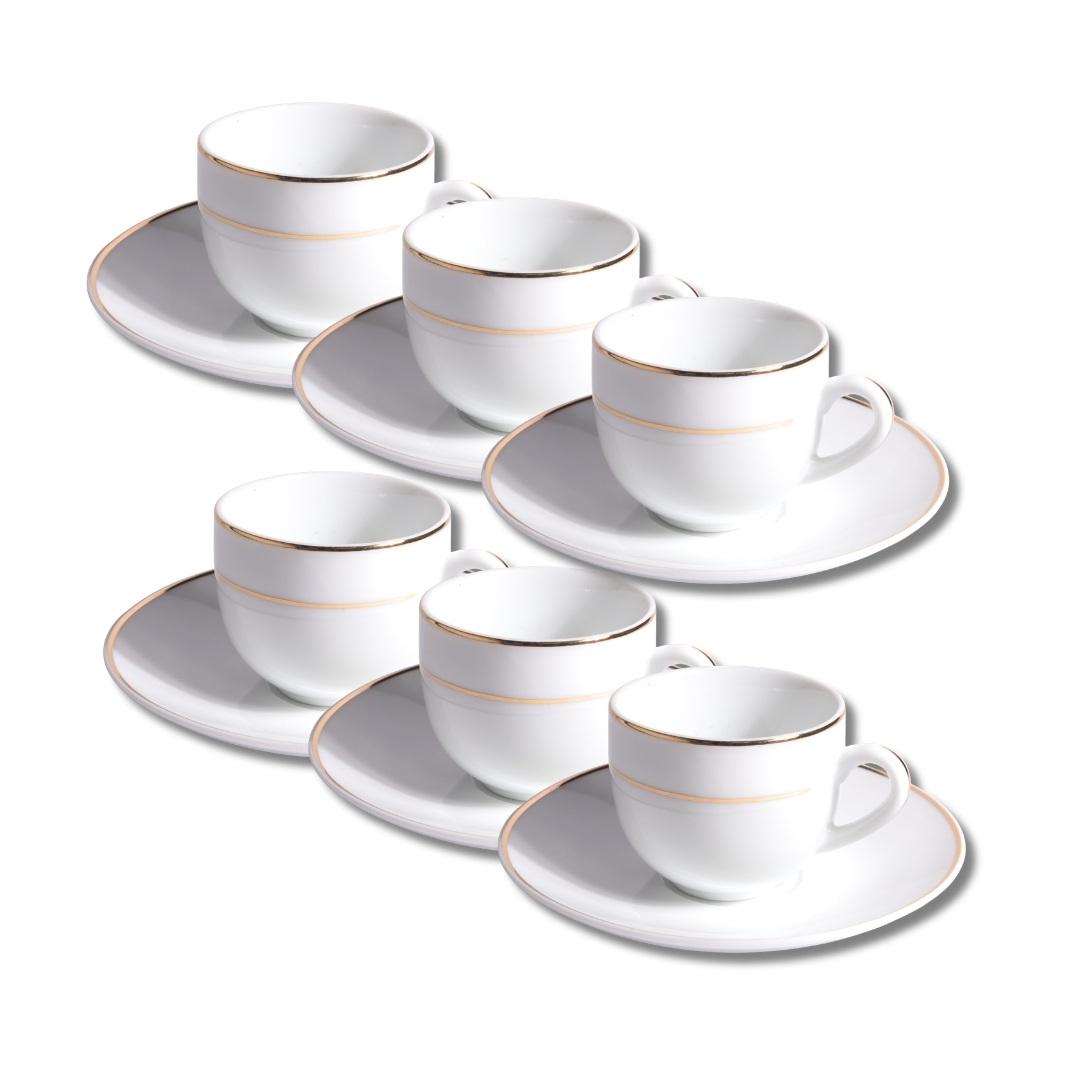 Jogo 6 xícaras de chá 220 ml com pires, na cor branca com friso dourado, coleção MAJESTY, por L'HERMITAGE. Produtos em porcelana de alta qualidade, com delicado acabamento dourado.