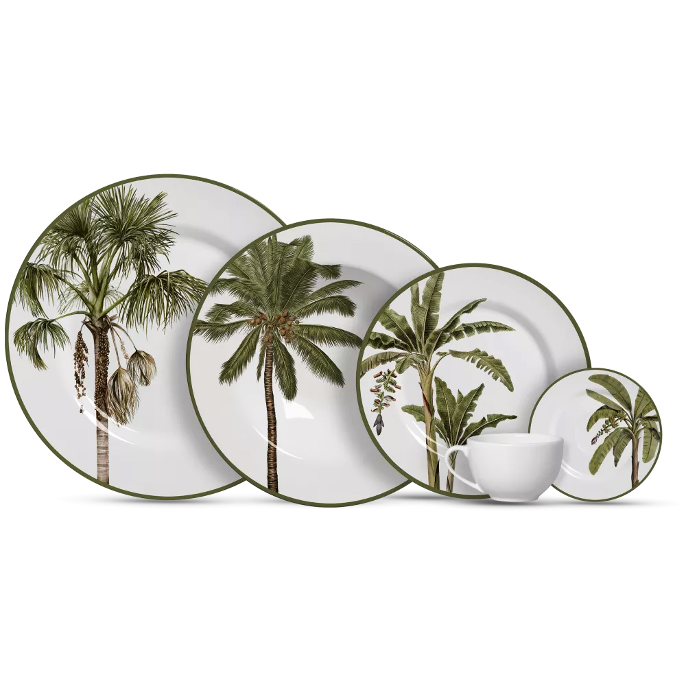 Composta por peças brancas de estilo clean, a coleção é decorada com estampas realistas de árvores tropicais em tons de verde e marrom, contornadas por uma borda verde-oliva. Um design que une frescor e sofisticação para ambientes descontraídos com elegância.